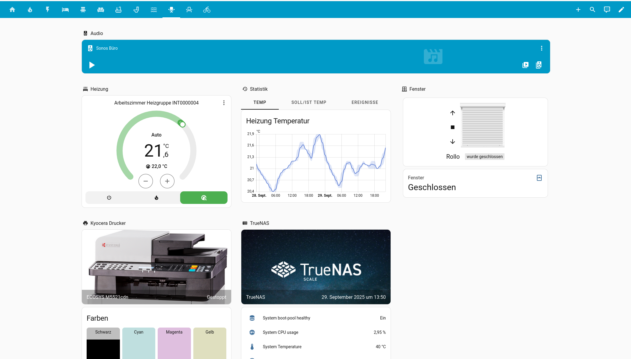 Verbaut ist eine Mischung aus verschiedensten Komponenten wie Homematic, Shelly oder auch eigens gebaute ESPs. Ebenso sind Türklingeln von Doorbird, Kameras von Ubiquiti und Sonos Lautsprecher im System. Über Home Assistant sind sie trotzdem perfekt verzahnt, ein Alarm eines Homematic Türsensors kann bspw. einen Sound über die Sonos Lautsprecher ausgeben.