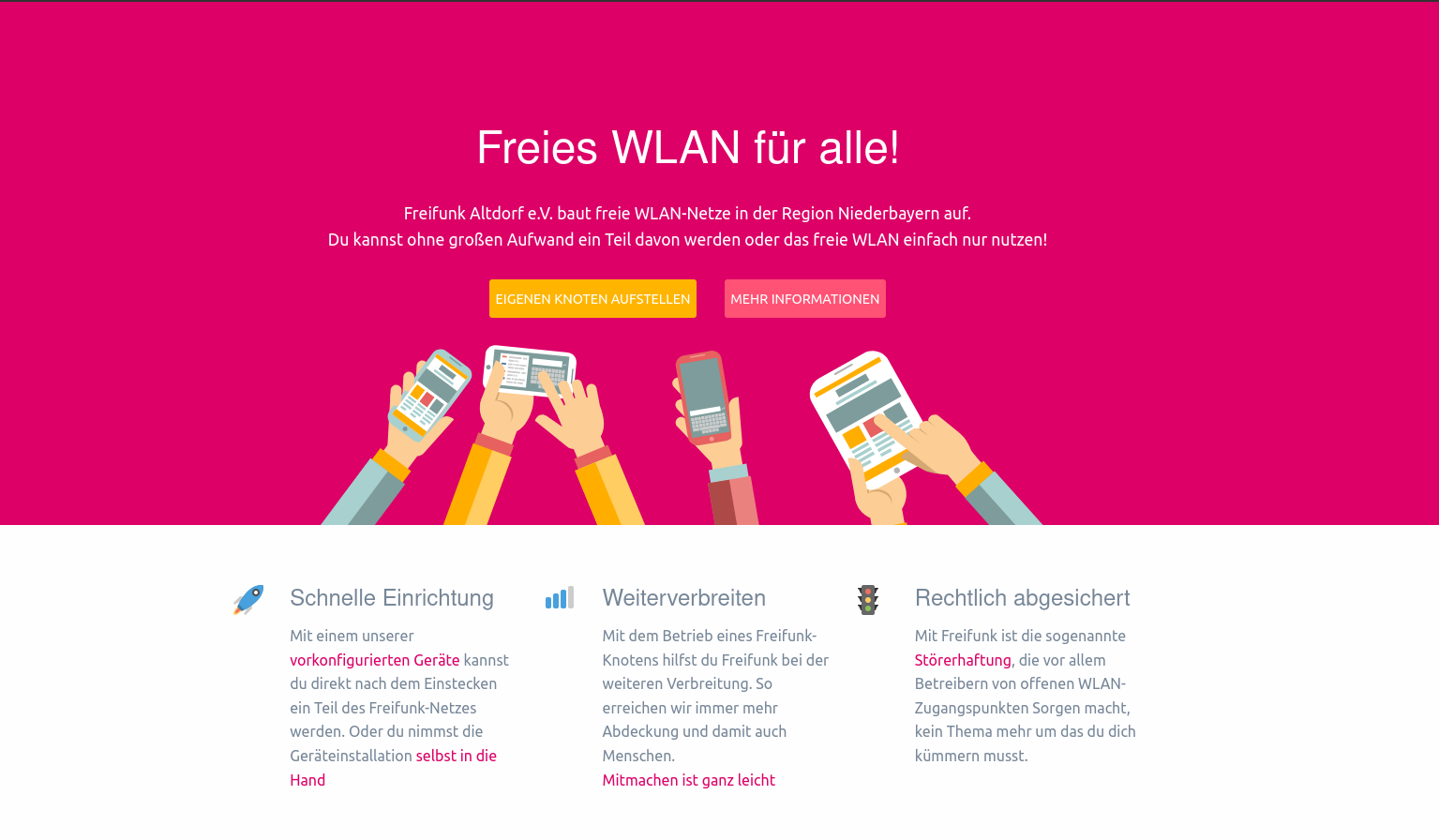 Freifunk Altdorf e.V. baut freie WLAN-Netze in der Region Niederbayern auf. Du kannst ohne großen Aufwand ein Teil davon werden oder das freie WLAN einfach nur nutzen!