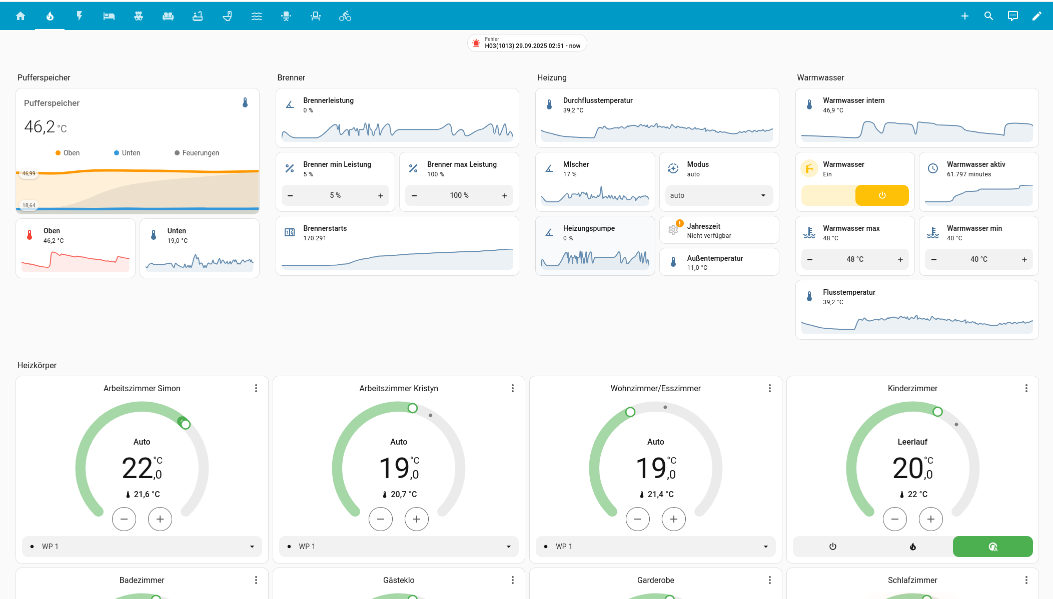 2018 wollte mir noch kein Heizungsbauer eine Wärmepumpe empfehlen, daher arbeitet hier noch eine Buderus Brennwerttherme. Mit EMS-ESP und einigen Homematic Sensoren kann man aber auch diese Smart machen und bspw. automatisch nach Anwesenheit regeln. Ergänzt wird das System durch smarte Thermostate an den einzelnen Heizkörpern.